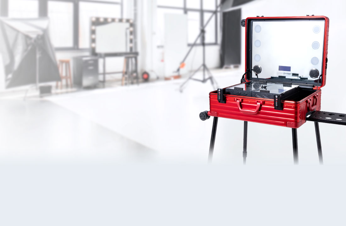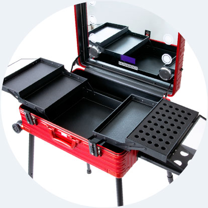 海外メイクアップアーティストの間で人気を博しているキャリーケース型ドレッサーを、今回初めて日本仕様に開発しました。高級感のあるアルミボディで、スキンケア用品・メイクアップ用品・ヘアケアアイテムなど、いつもお使いのラインナップをすべて、手軽に現場へ持ち運びができ、あなたのプロフェッショナルな仕事を支えます。